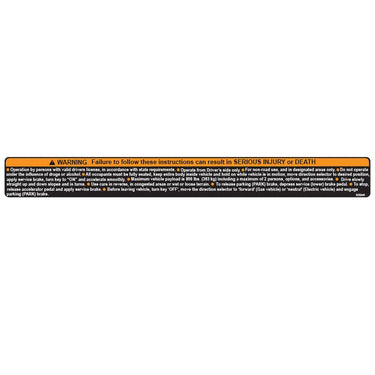The E-Z-GO 625240 Safety Console Label is an essential component designed to enhance the safety and functionality of your E-Z-GO vehicle. This high-quality label is crafted to provide clear and concise safety instructions, ensuring that users are well-informed about the operational guidelines and safety precautions necessary for the optimal use of their vehicle. The label is made from durable materials that withstand various environmental conditions, ensuring longevity and reliability. It is specifically designed to fit seamlessly onto the console of your E-Z-GO vehicle, providing a professional and integrated appearance.