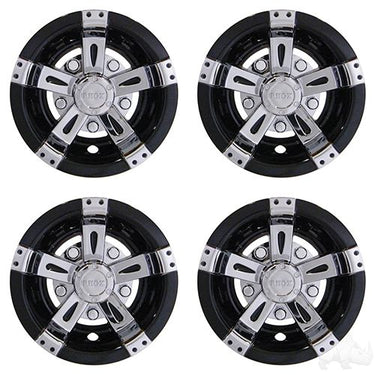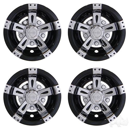 The RED HAWK LLC CAP-0048-4 RHOX Wheel Cover Set offers a premium, four-piece upgrade for 8-inch wheels, blending style with practical protection for your golf cart or lightweight vehicle. The Vegas Chrome/Black finish delivers a bold, modern look that stands out while defending rims from dirt and debris.